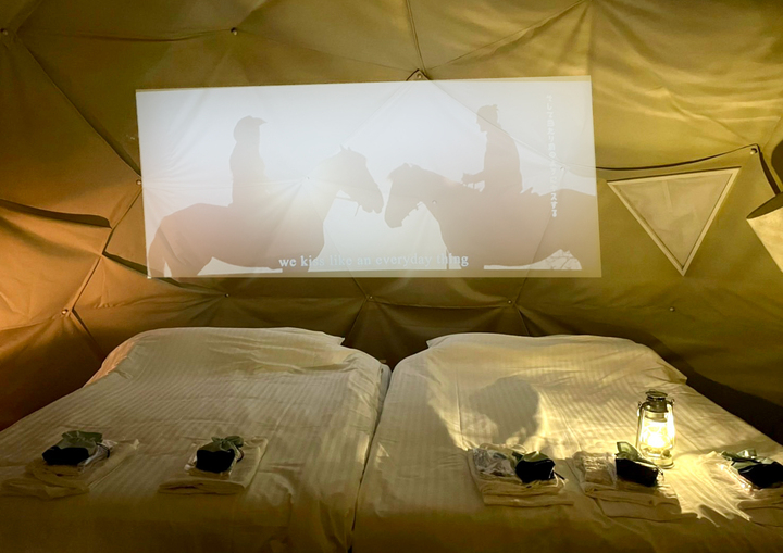 施設内の客室は塀で囲まれており、完全プライベートな空間。屋外でもテント内でも自由な場所で動画鑑賞が楽しめます。