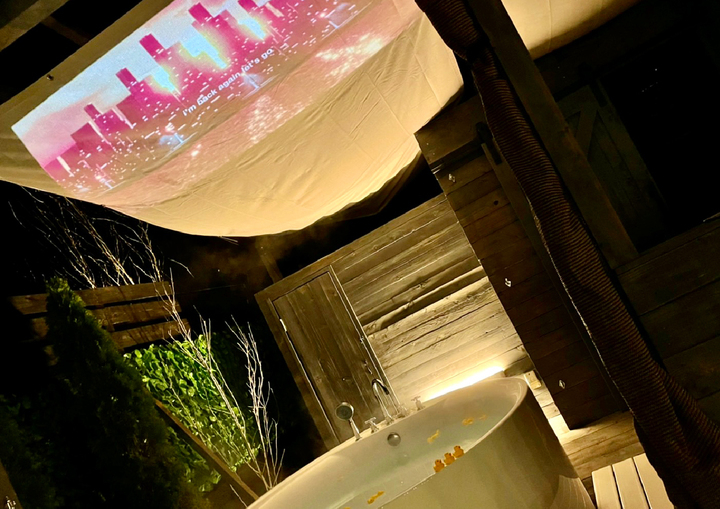 期間中は各客室に CINEMAGE mini を1台ご用意。テント内はもちろんジャグジーを楽しみながら、たき火で温まりながら等、お気に入りの場所で映画鑑賞が楽しめます。