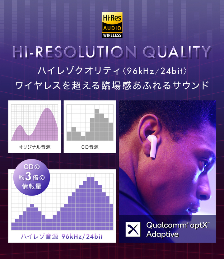 1.「AAC」、「Apt-X」のほか「Apt-X Adaptive」のハイレゾ級音声コーデックに対応した高音質を実現
